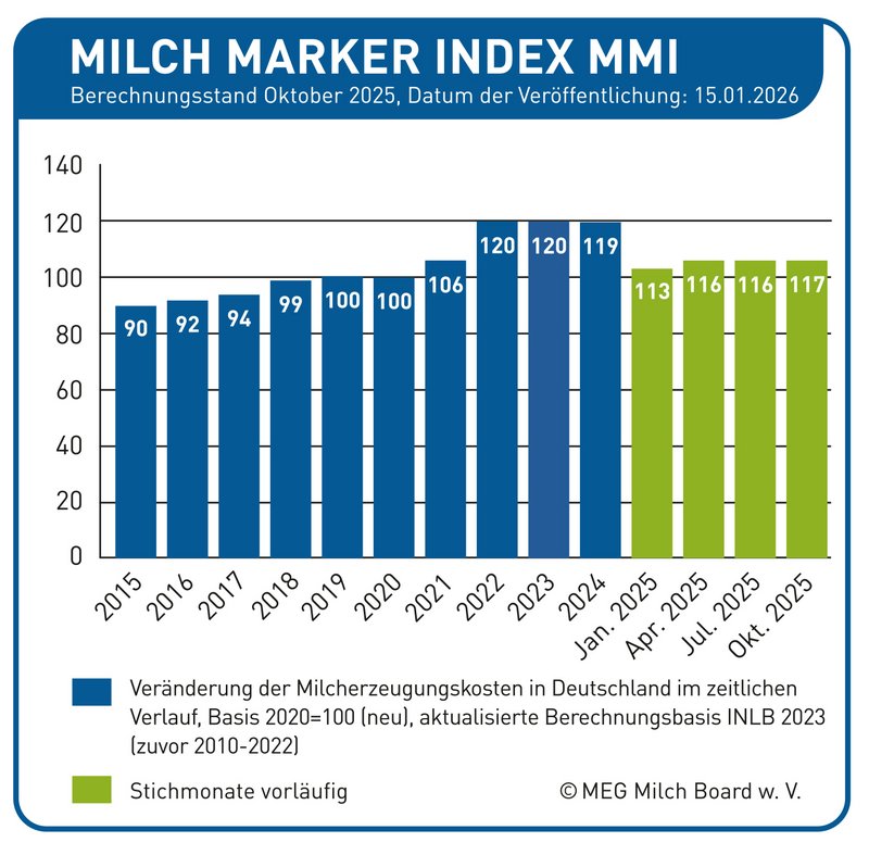 Der Milch Marker Index liegt im Stichmonat Oktober 2025 bei 117. Die Milcherzeugungskosten sind gegenüber Juli 2025 leicht um 0,20 Cent je Kilogramm auf 53,73 Cent gestiegen. Kostentreiber waren erneut höhere Aufwendungen für die Unterhaltung von Gebäuden und Maschinen; entlastend wirkte dagegen der Rückgang der Futterkosten.Trotz des nur moderaten Kostenanstiegs hat sich die Lage spürbar verschärft: 7 Prozent der Erzeugungskosten konnten nicht mehr gedeckt werden, weil die Auszahlungspreise im selben Zeitraum deutlich um 3,43 Cent auf 49,94 Cent je Kilogramm fielen. Damit rutscht die Milcherzeugung insgesamt wieder in die Unterdeckung.