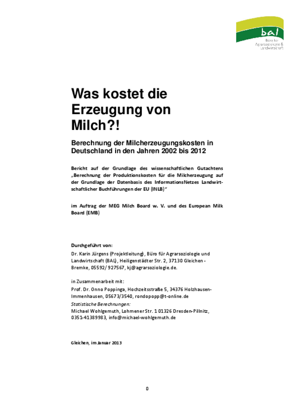 Das lange ersehnte Gutachten zu den Milcherzeugungskosten wurde im Januar 2013 fertig gestellt. Die MEG Milch Board ist damit ihrem zentralen Satzungszweck nachgekommen. Zusammen mit dem European Milk Board (EMB) wurde die Studie auf den Weg gebracht.