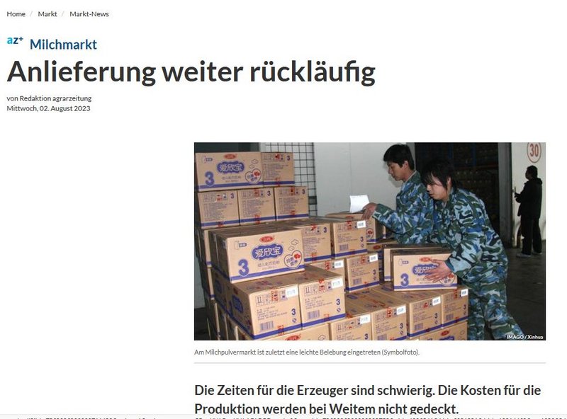 Markteinschätzung der MEG Milch Board in der agrarzeitung, Online-Ausgabe vom 02.08.2023