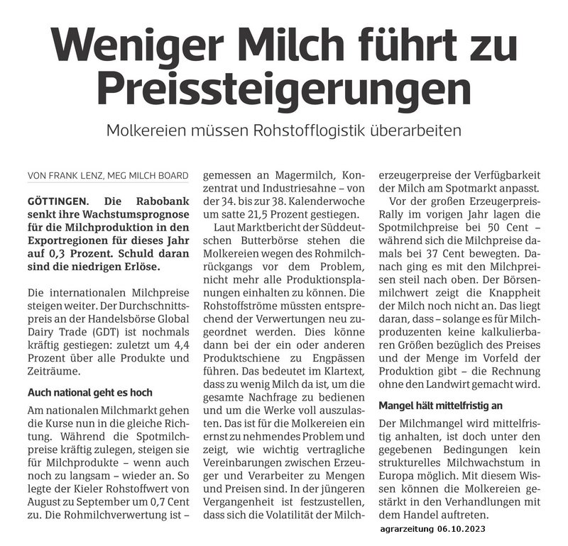 Markteinschätzung der MEG Milch Board in der agrarzeitung