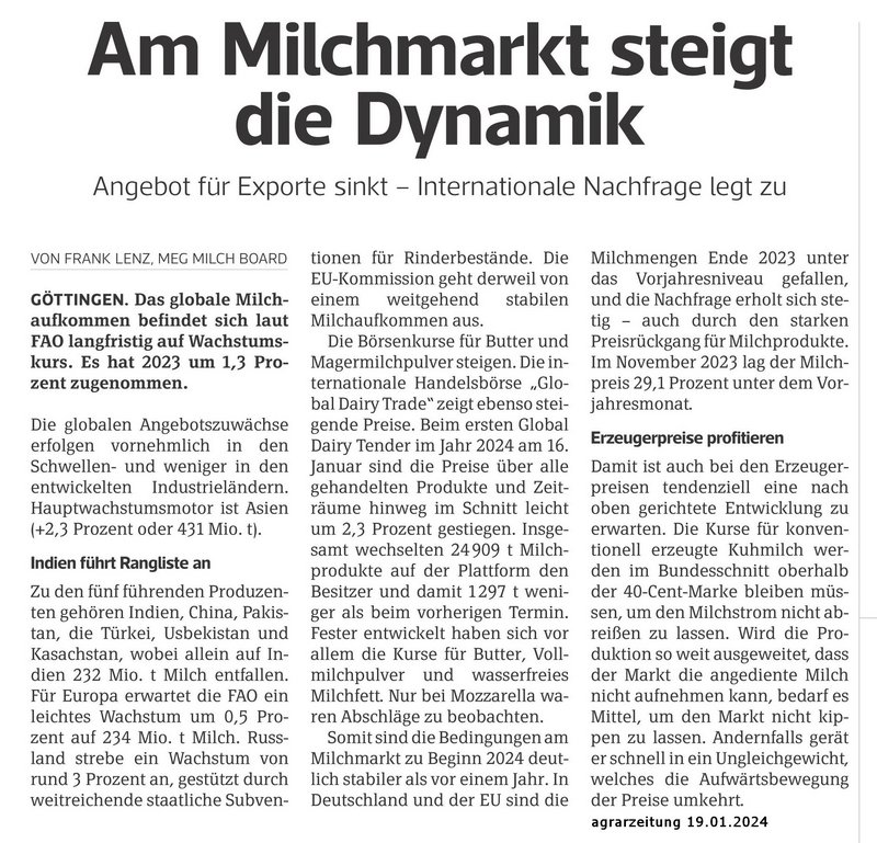 Somit sind die Bedingungen am Milchmarkt zu Beginn 2024 deutlich stabiler als vor einem Jahr. In Deutschland und der EU sind die Milchmengen Ende 2023 unter das Vorjahresniveau gefallen, und die Nachfrage erholt sich stetig - auch durch den starken Preisrückgang für Milchprodukte. Im November 2023 lag der Milchpreis 29,1 Prozent unter dem Vorjahresmonat.