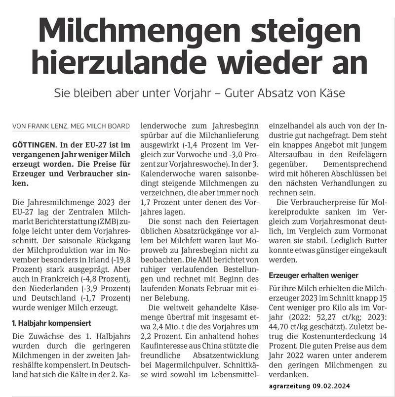 Die Jahresmilchmenge 2023 der EU-27 lag der Zentralen Milchmarkt Berichterstattung (ZMB) zufolge leicht unter dem Vorjahresschnitt Der saisonale Rückgang der Milchproduktion war im November besonders in Irland (-19,8 Prozent) stark ausgeprägt Aber auch in Frankreich (-4,8 Prozent), den Niederlanden (-3,9 Prozent) und Deutschland (-1,7 Prozent) mirde weniger Milch erzeugt.