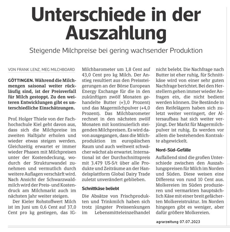 Markteinschätzung der MEG Milch Board in der agrarzeitung, Ausgabe vom 07.07.2023