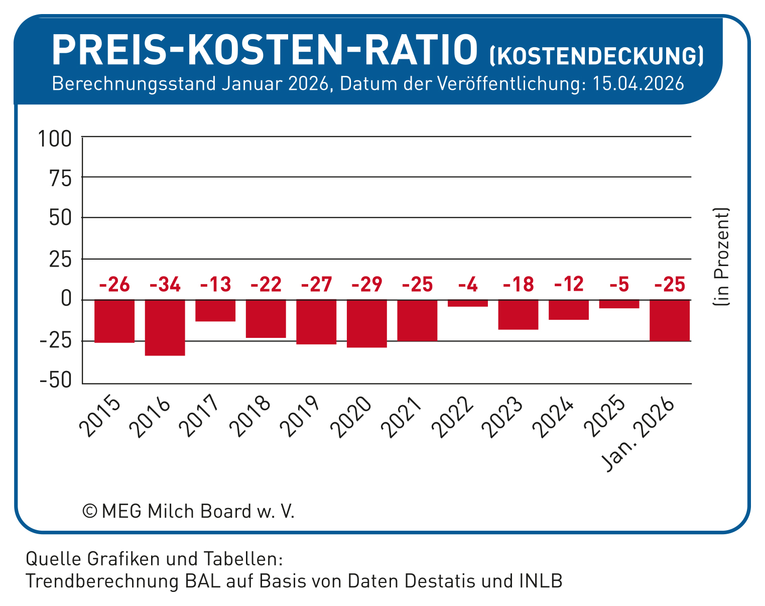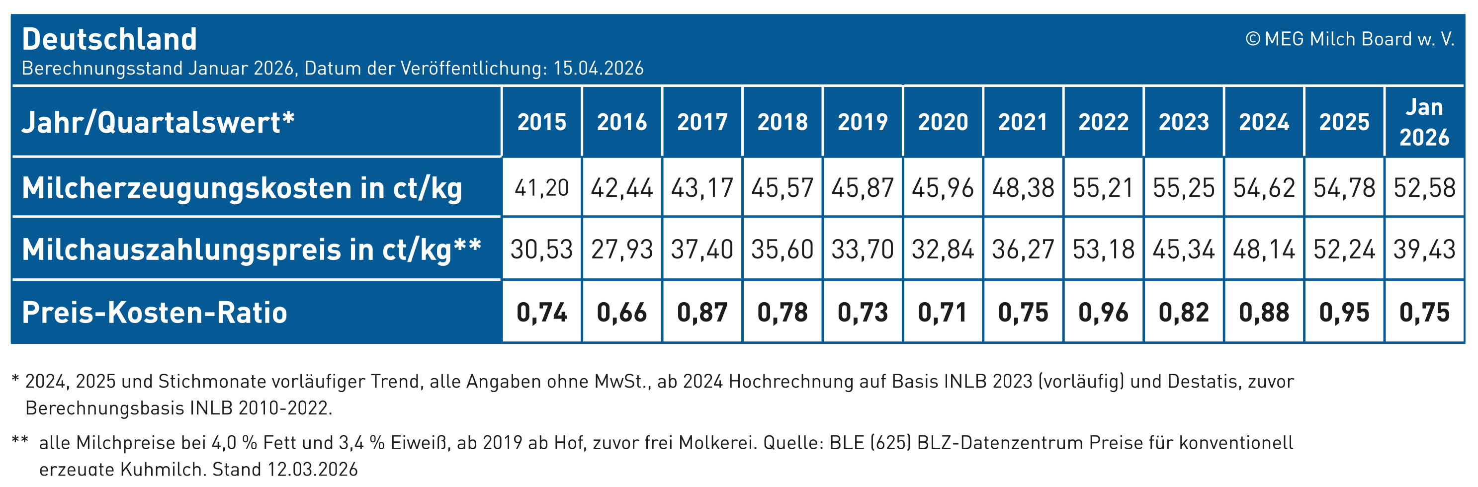 Während für das Jahr 2025 im Deutschlandmittel noch eine vergleichsweise geringe Kostenunterdeckung von rund 5 Prozent festgestellt wurde, zeigen die Zahlen im Januar 2026 nun das volle Ausmaß der aktuellen Milchkrise. Innerhalb von nur drei Monaten ist der Milchpreis um 21 Prozent gesunken.