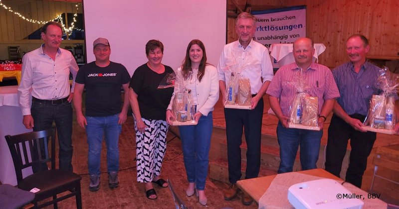 Bild von links nach rechts: Wolfgang Scholz (BBV-Kreisobmann WM-SOG, Josef Taffertshofer (BDM Kreistam WM-SOG), Christine Sulzenbacher (BBV-Kreisbäuerin WM-SOG), Charlotte Roth (Milchreferentin BBV), Günther Felßner (Präsident BBV), Thomas Bertl (Vorsitzender 1. Bayerisches Butterwerk), Hermann Fischer (Vorstand MEG Milch Board), Bild: Thomas Müller, BBV