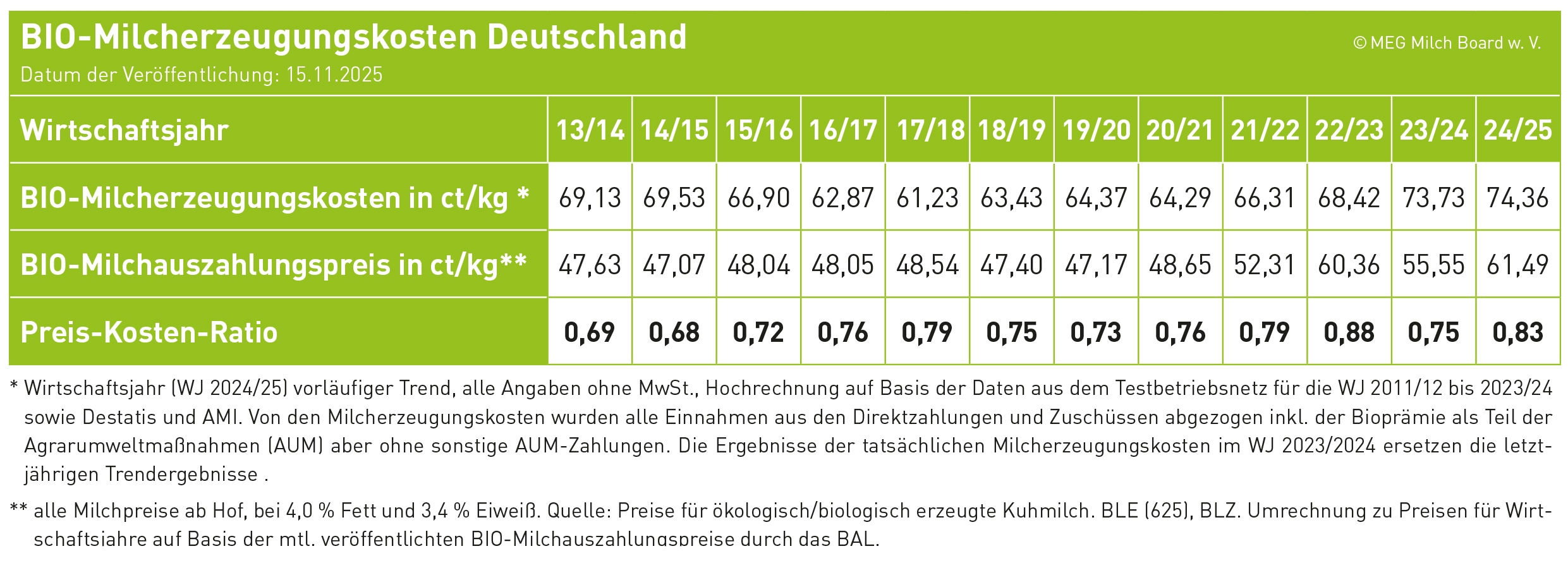 Die Erzeugerpreise für Biomilch legten um 11 Prozent zu – von 55,55 auf 61,49 Cent pro Kilogramm – und verringerten die Kostenunterdeckung von −25 auf −17 Prozent. Damit deckt der Biomilchpreis im Wirtschaftsjahr 2024/25 rund 83 Prozent der Erzeugungskosten. Im August 2025 lagen die Preise bei etwa 66 Cent pro Kilogramm.